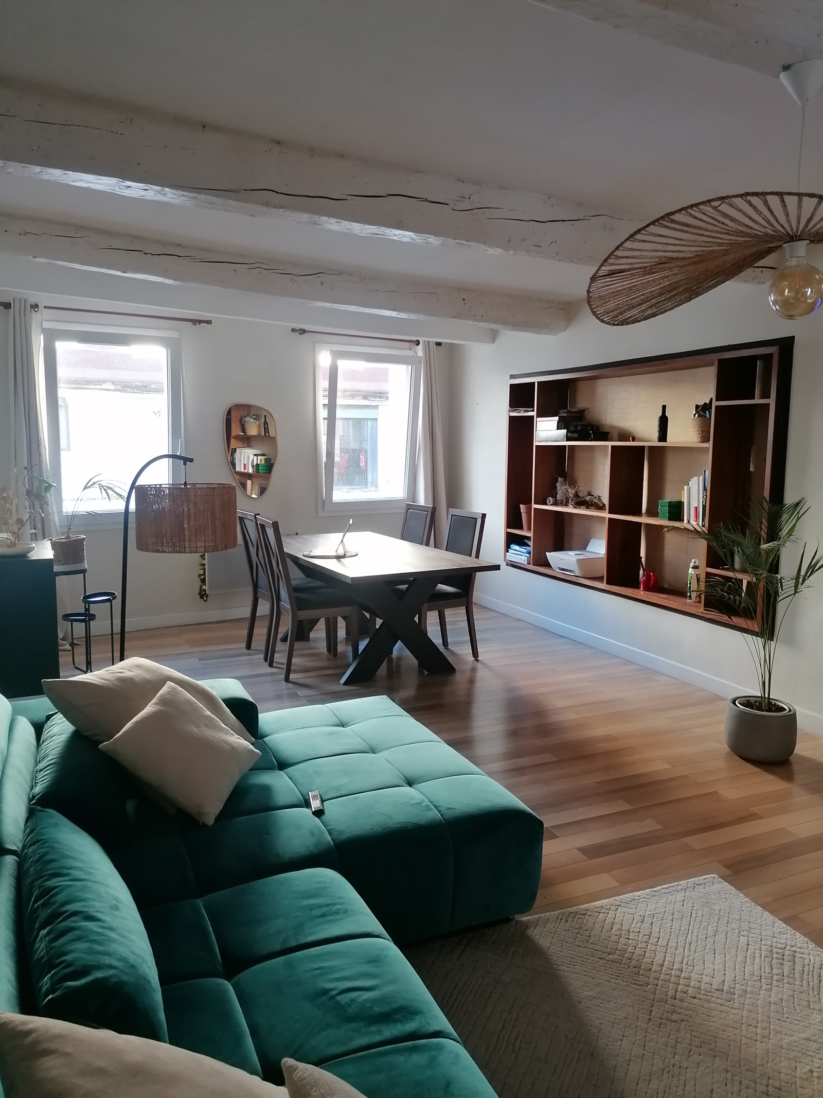 Il se compose d'un spacieux séjour de 30 m2 avec son parquet et ses poutres apparentes avec vue sur la rue piétonne, d'une grande cuisine séparée entièrement équipée avec son arrière cuisine et sa buanderie, d'une entrée avec ses placards, d'une salle d'eau avec meuble vasque, douche et WC. Il dispose aussi d'une grande chambre de 17 m2 avec son dressing, sol en parquet, mais aussi d'une loggia avec vue sur le canal de la Robine.
