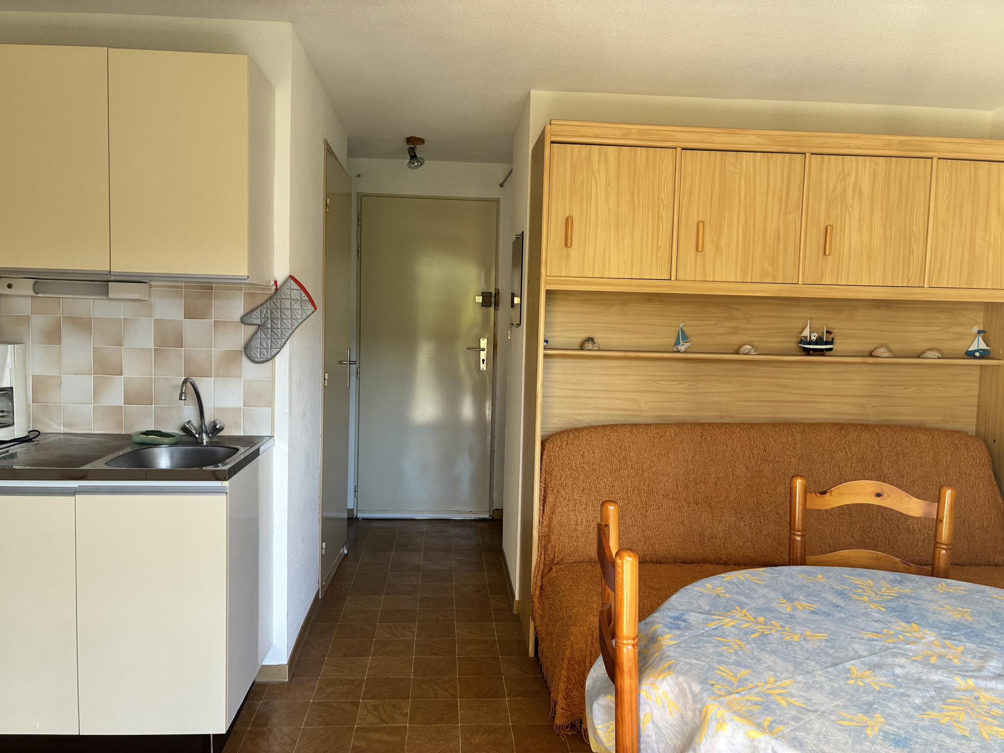 Gruissan (11430)EN EXCLUSIVITE, RIVE DROITE, idéalement situé venez découvrir ce coquet studio cabine de 20 m² environ, composé d'une pièce principale lumineuse, une cabine séparée pour optimiser l'espace, une kitchenette fonctionnelle, une salle d'eau avec wc, une grande terrasse de 6 m² ainsi qu'une place de parking privative dans la résidence.