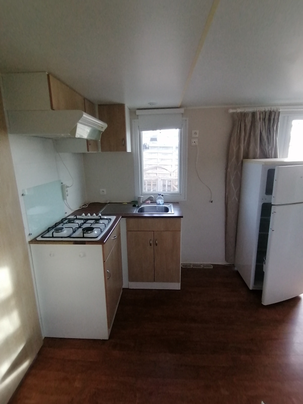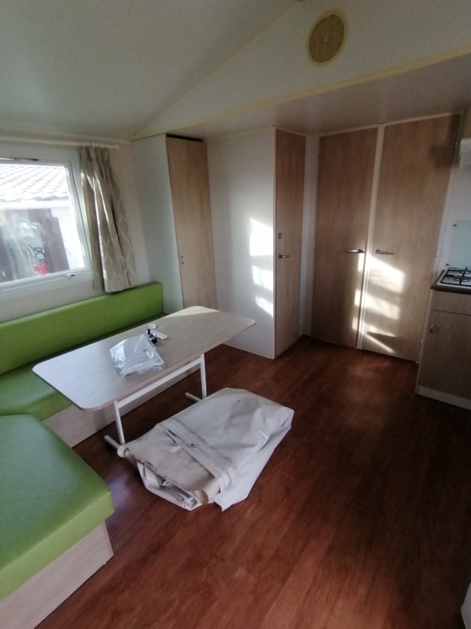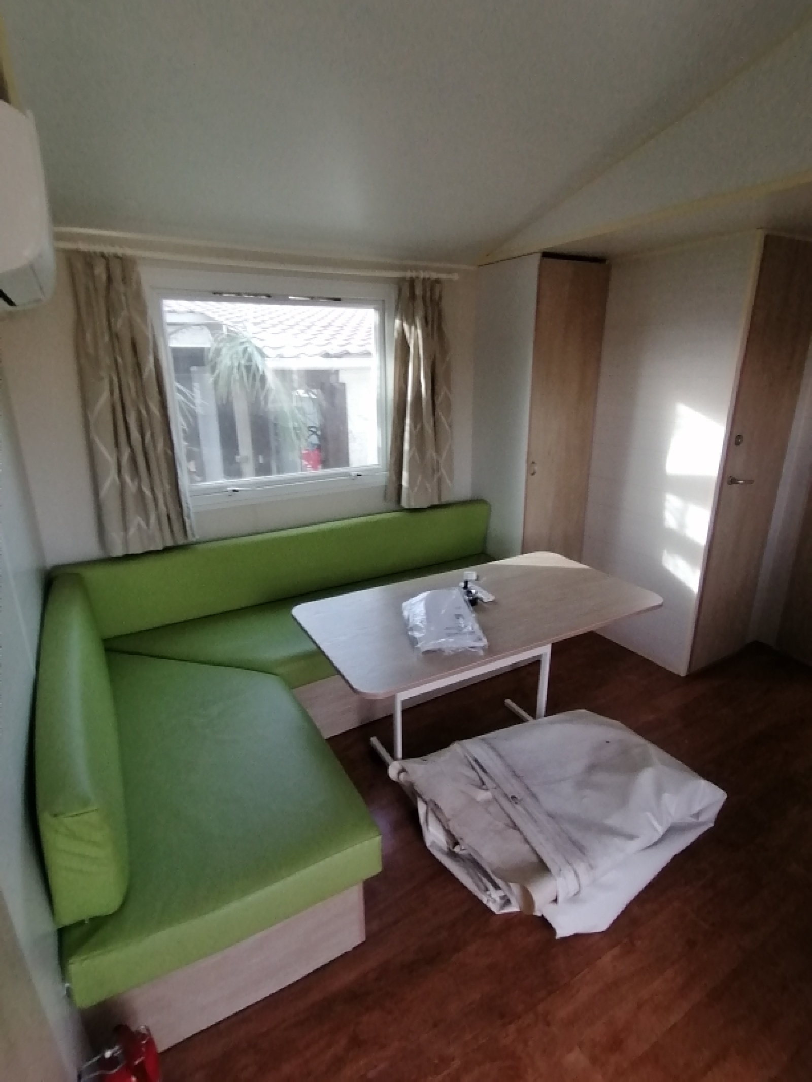 Le mobil home contient un séjour avec sa cuisine équipée, 3 chambres, une salle d'eau avec vasque et douche, un WC séparé. Possibilité de 8 couchages. Mobil home de marque O'Hara de 2015. Climatisation réversible neuve.