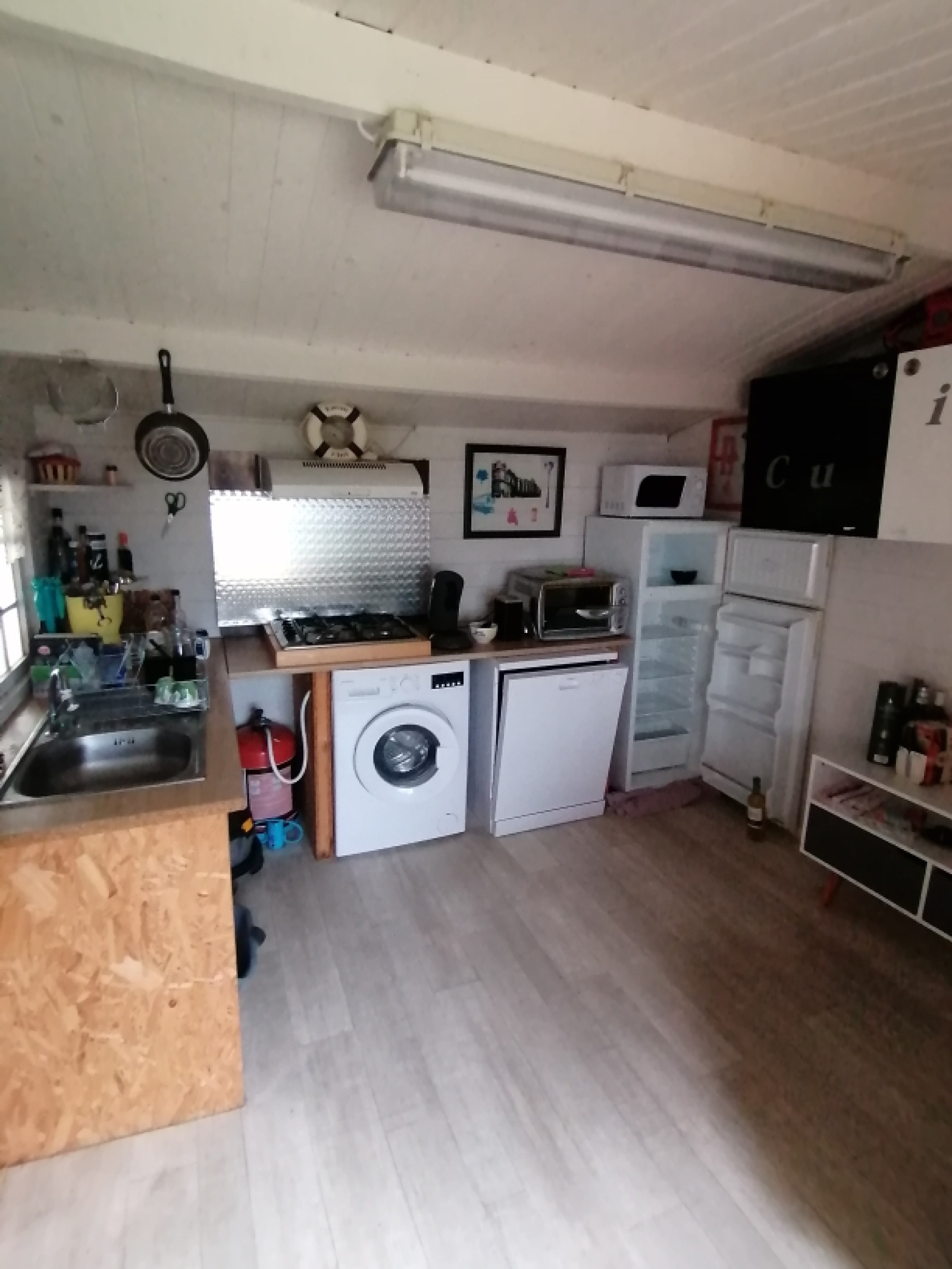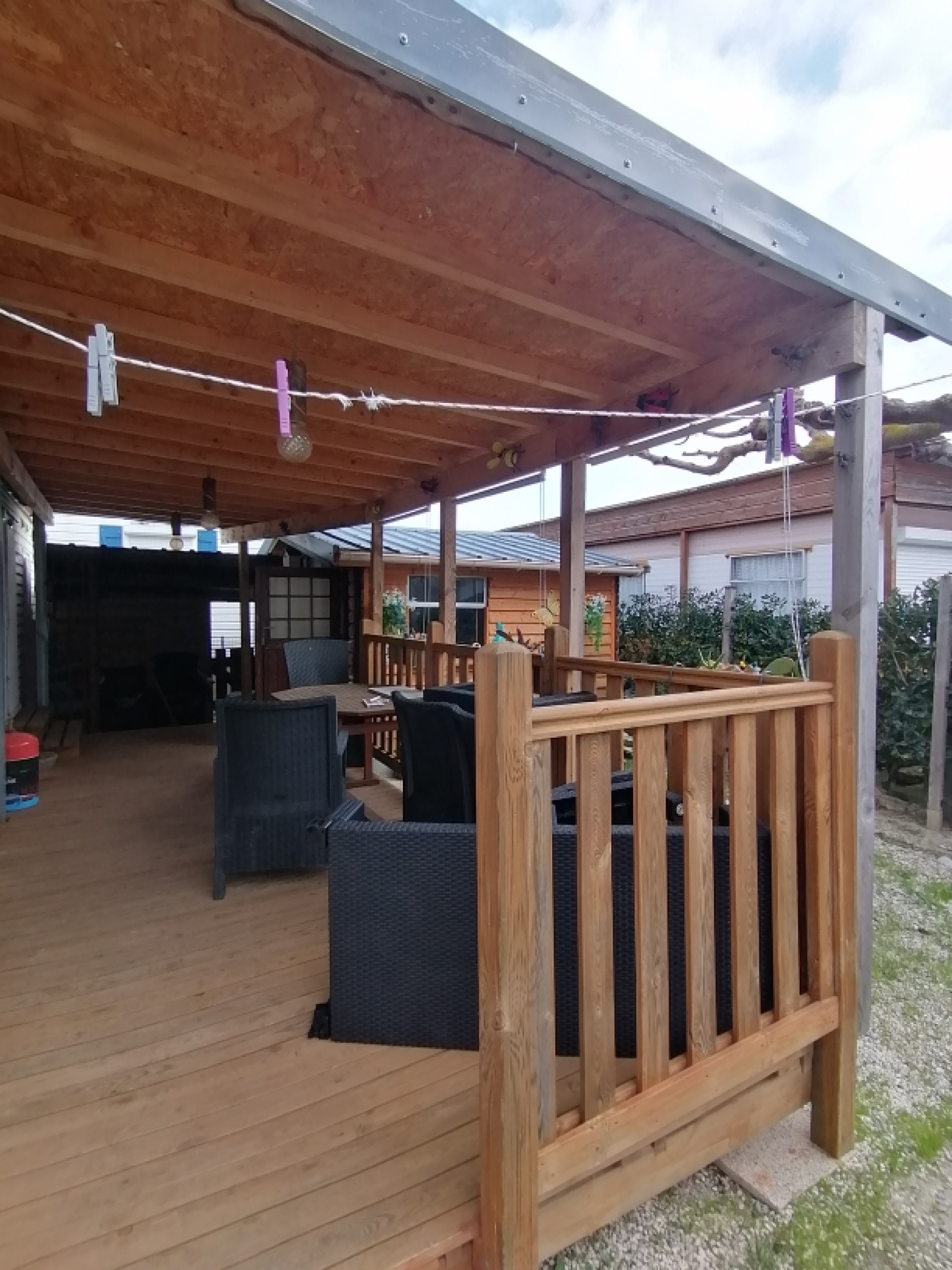 Mobil home de 38 m2 avec un grand séjour, une chambre avec lit double et un lit pour enfant et salle d'eau avec douche, vasque et WC + Chalet de 10 m2 avec cuisine + Une grande terrasse en bois couverte. Possibilité de couchages supplémentaires dans le séjour.